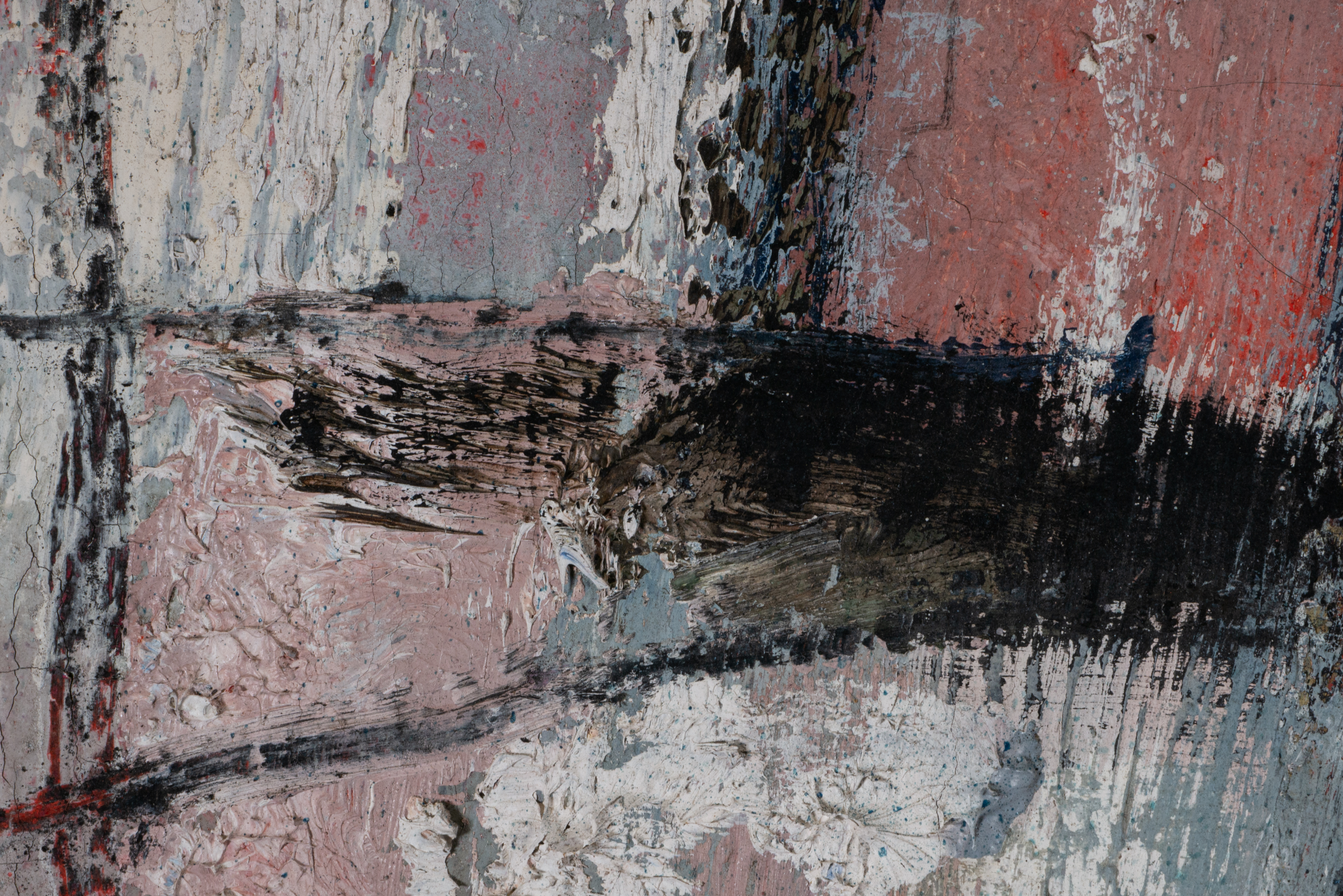 This work by Josef Steiner is rendered in a modern abstract expressionist style, featuring bold, gestural strokes in black that create a striking contrast against a palette of pale blue, white, and hints of red. The composition appears loosely structured, with heavy, textured lines forming abstract shapes that suggest architectural or structural elements. Steiner’s use of thick paint layers and rough, expressive brushstrokes gives the artwork a raw and dynamic quality, creating an impression of movement and depth. This abstraction prioritizes form and texture over detail, aligning with the artist’s expressionist tendencies.