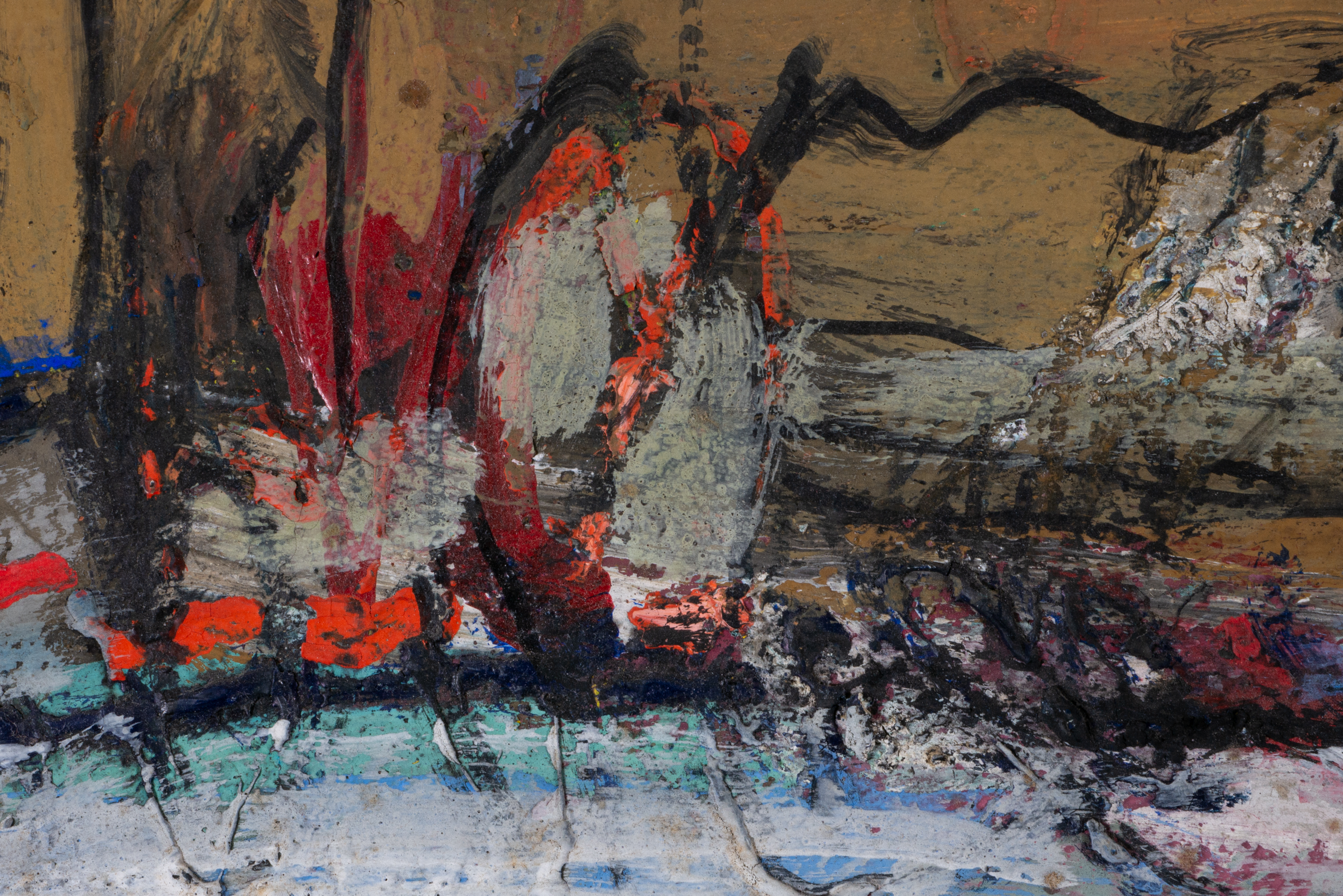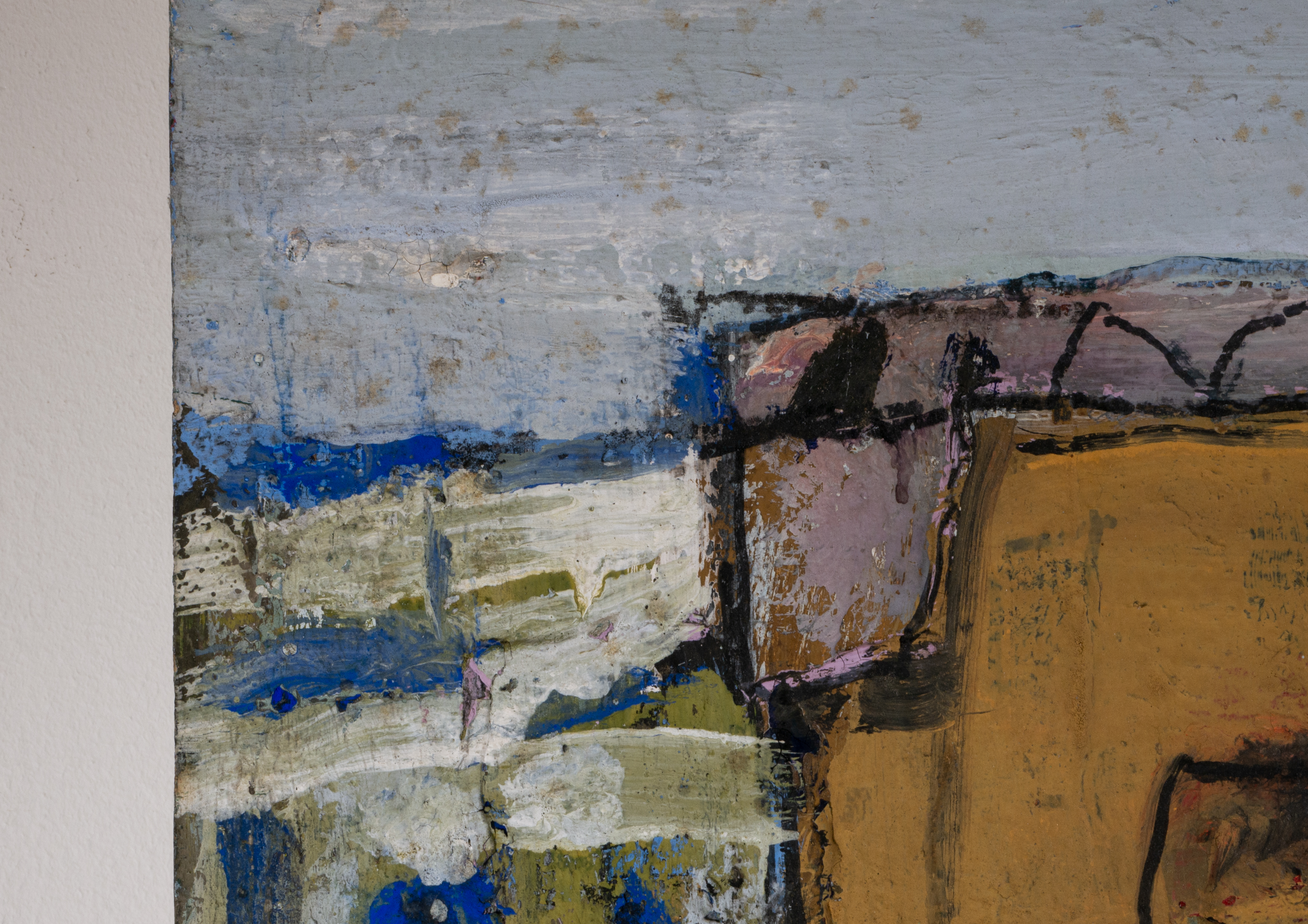 This piece by Josef Steiner showcases a modern expressionist landscape with loose, textured brushstrokes and a muted, earthy palette. The composition primarily features abstract architectural forms and subtle geometric shapes, with a dominant mustard-yellow rectangle bordered by lighter tones and rough, uneven lines. This roughness in texture and form reflects Steiner’s expressionist style, which leans on distorted perspectives and simplified shapes to convey an emotional impression of the landscape rather than a realistic depiction. The bold, expressive lines add a dynamic quality, drawing attention to the central structure.