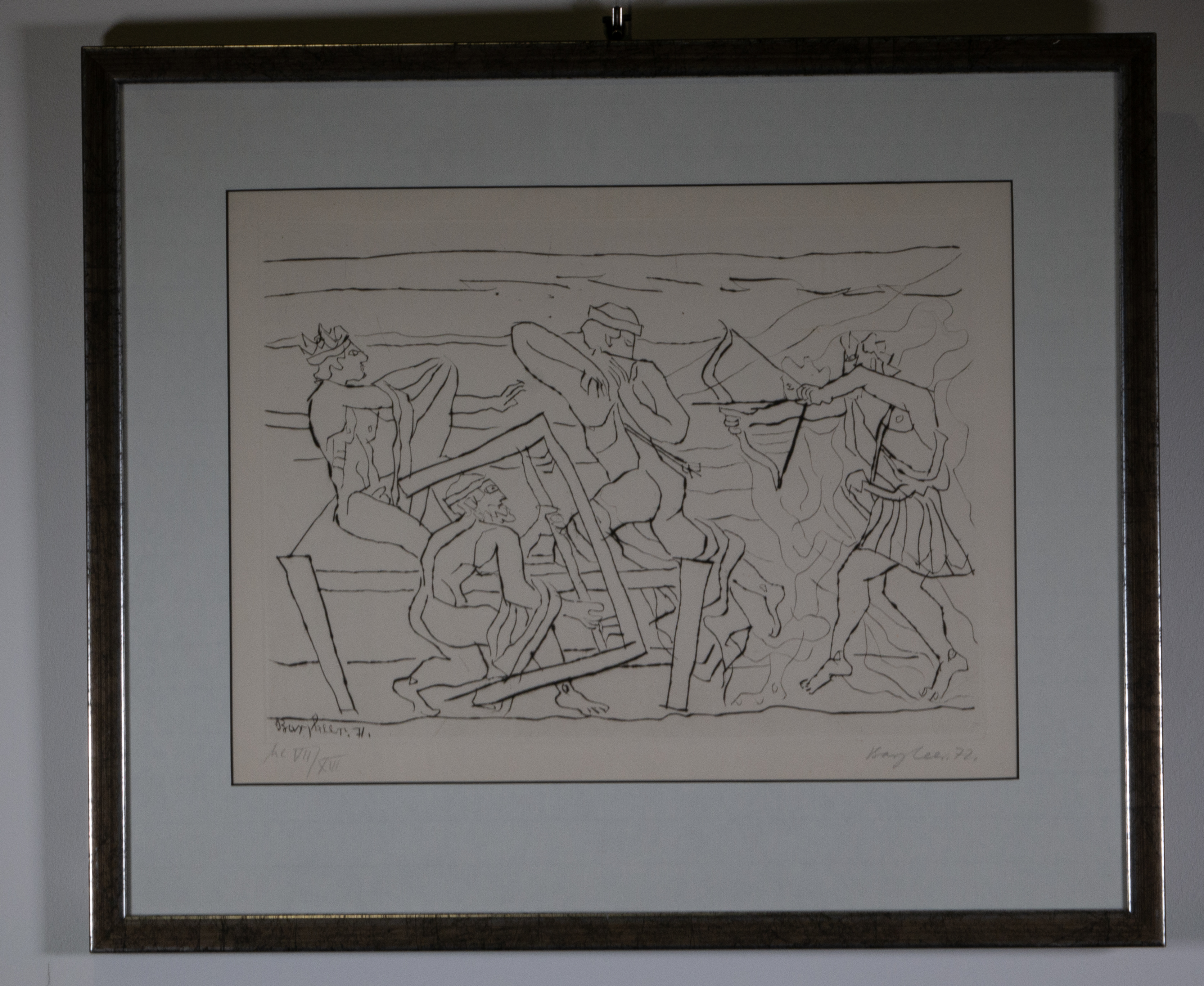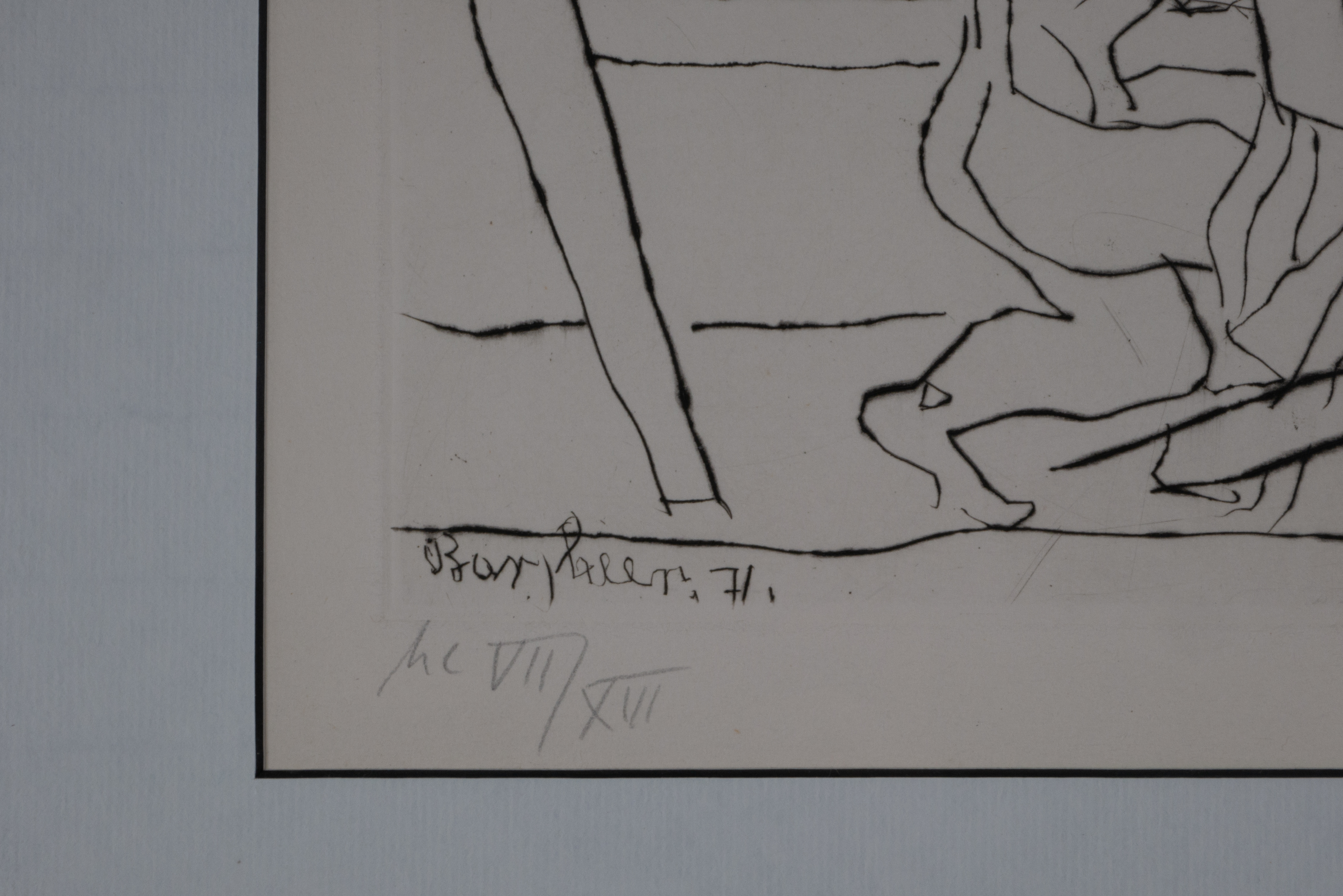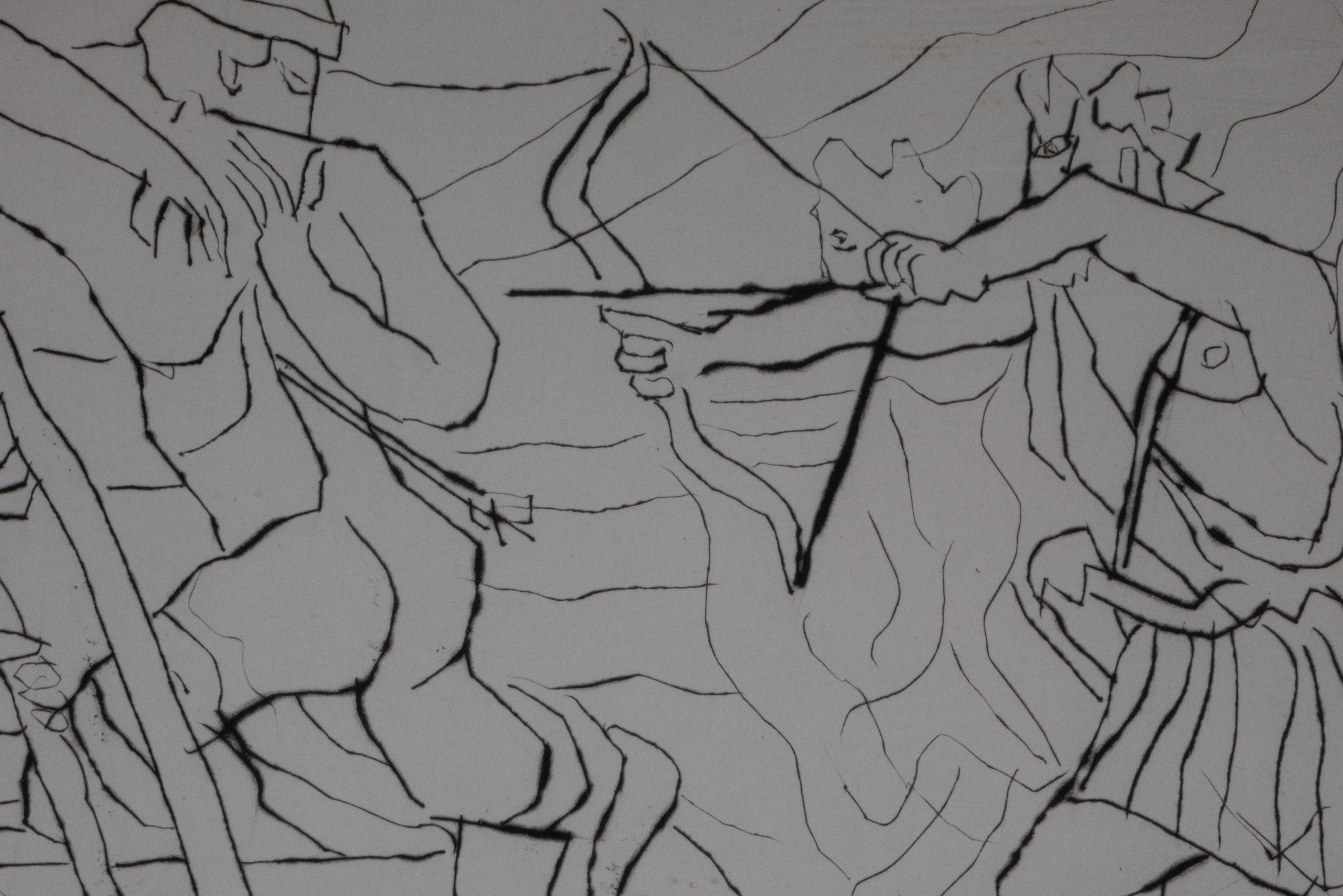 Eduard Bargheer's Kampfszene mit Bogenschützen (1971/1972) is a striking line drawing that depicts a mythologically inspired scene. The artwork features fluid and expressive lines forming human figures engaged in an enigmatic interaction. The characters, with simplified anatomy and stylized forms, appear in dynamic poses, suggesting movement and narrative. The sparse composition relies on bold contours to create a rhythmic interplay between the figures and the surrounding negative space. The classical themes evoke ancient Greek culture, reflected in the characters' attire and gestures, while the minimalistic style emphasizes modernity and abstraction.