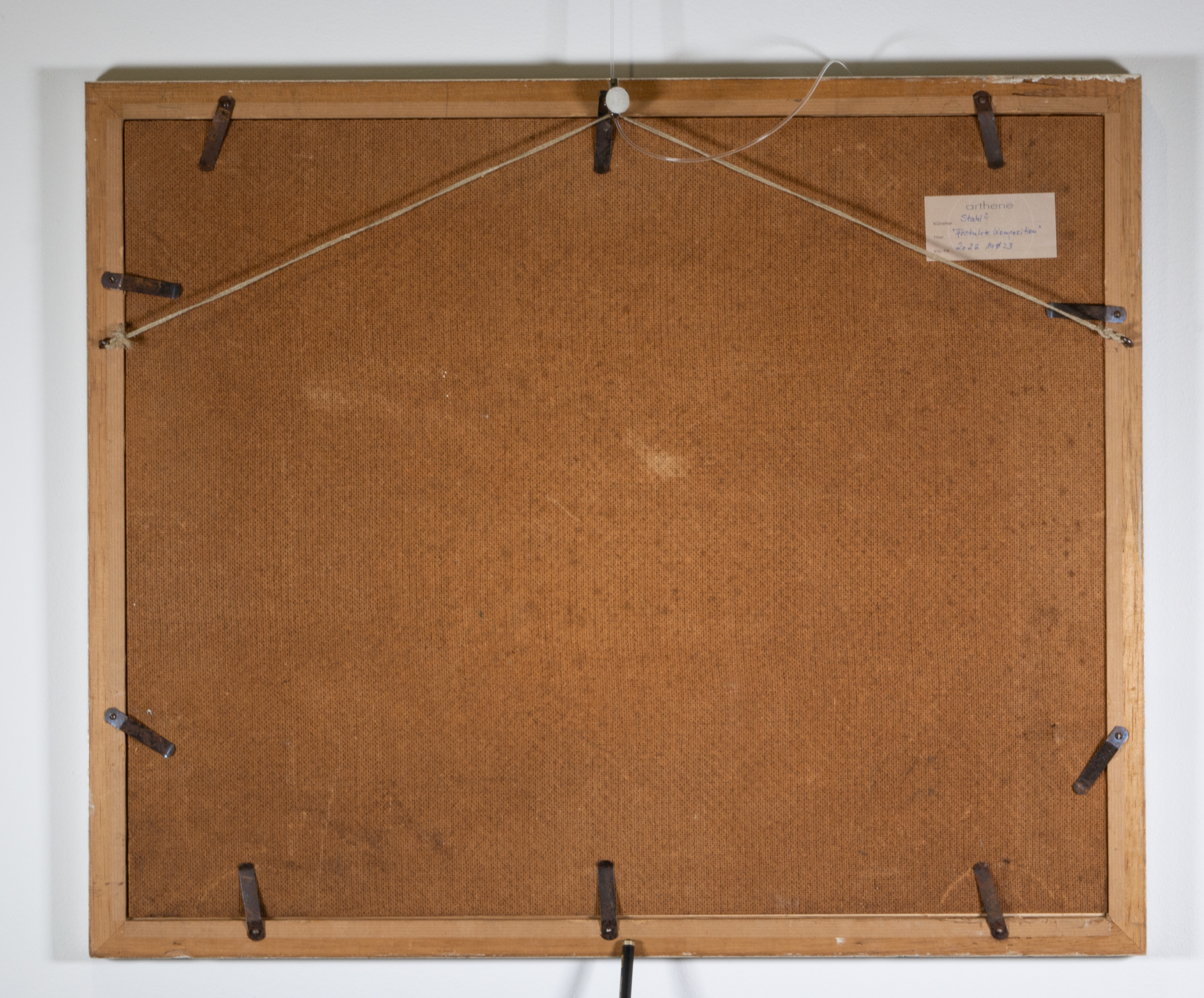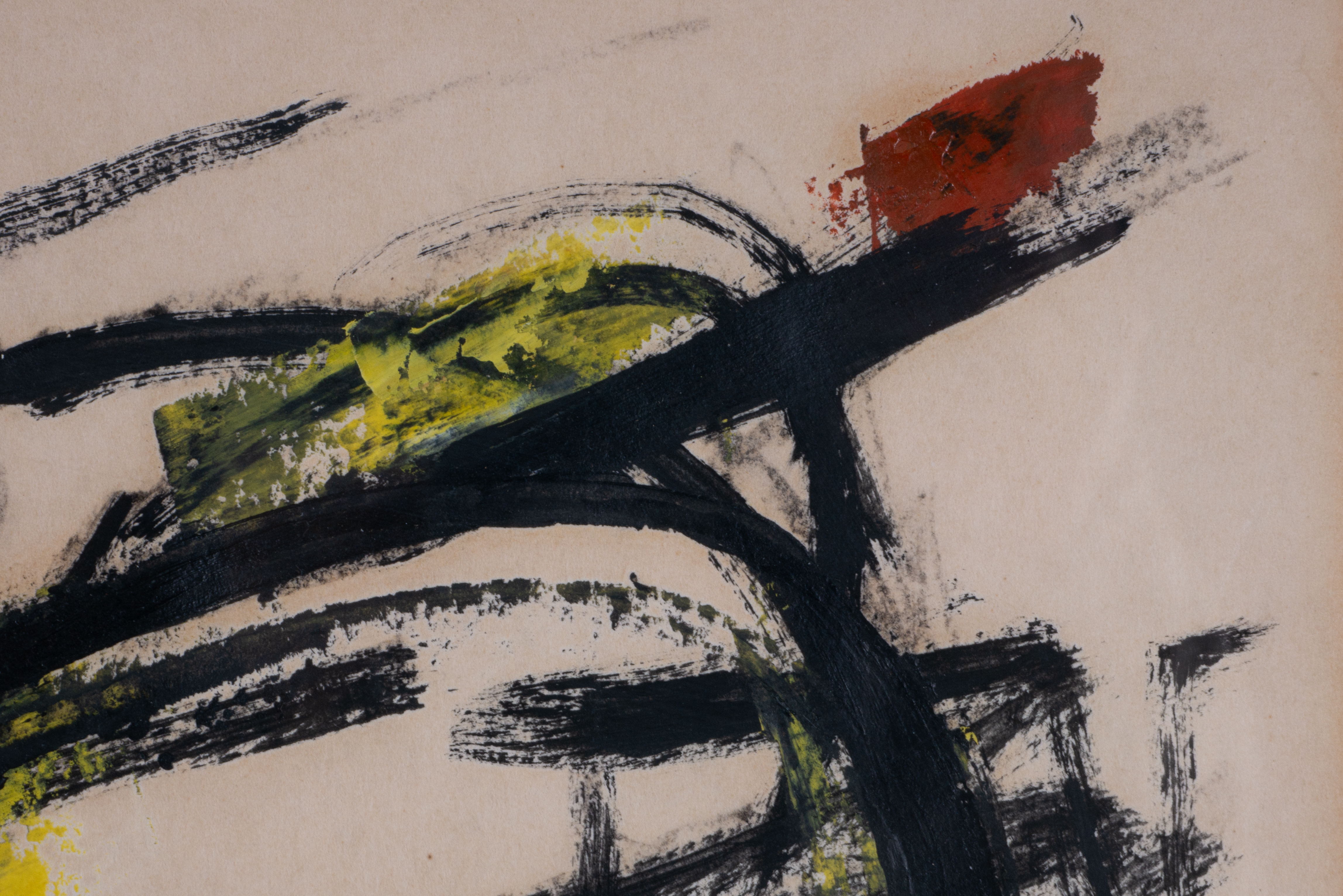 In the 1950s–70s, Art Informel was a widespread movement across Europe, deliberately rejecting geometric abstraction in favor of spontaneity, materiality, and emotional immediacy. This piece, with its raw energy and industrial collage element, also echoes early Arte Povera approaches or postwar graphic works with a technical undertone.